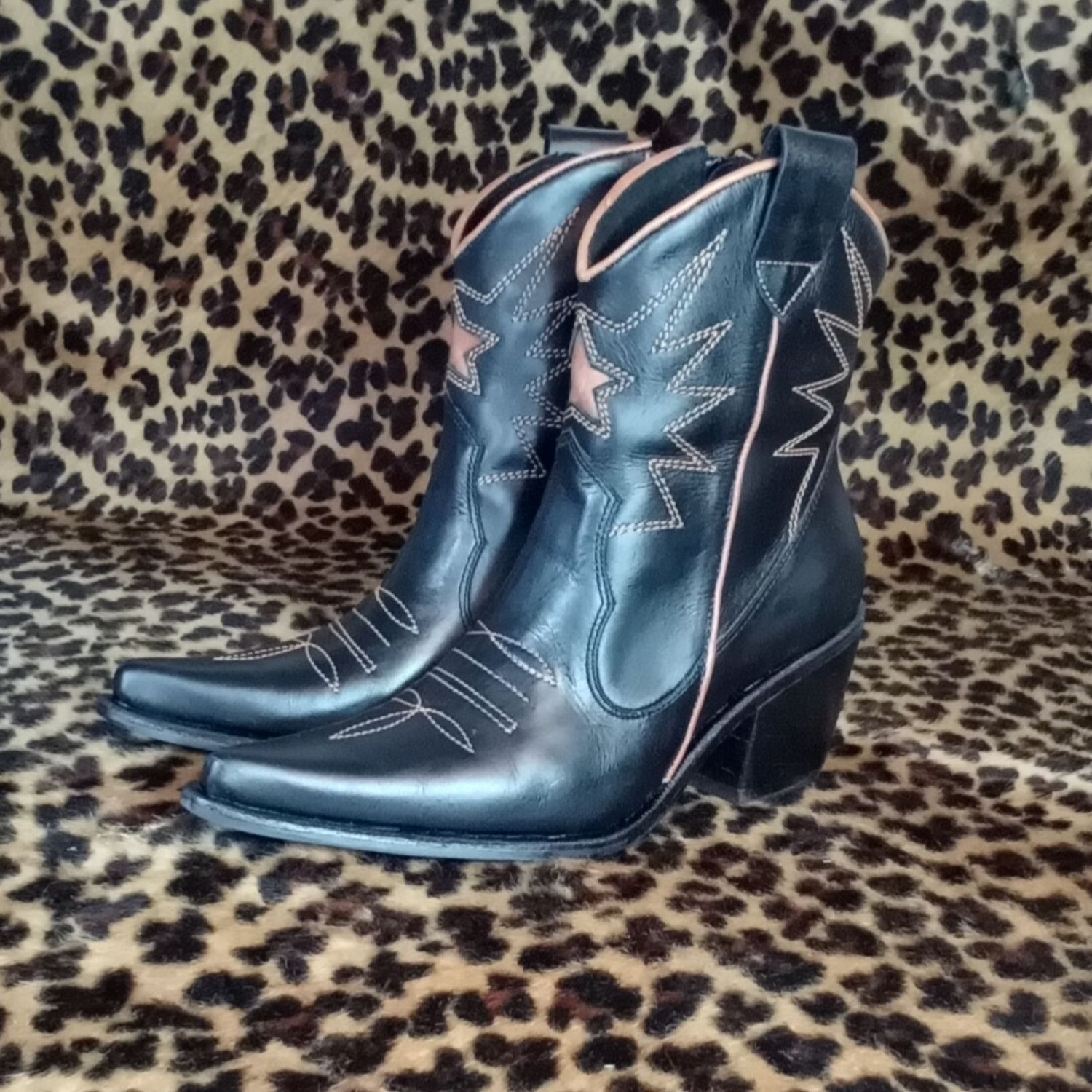 Botín Lusitano negro, un botín muy elegante y estilizado por su corte vaquero, detalles y aplicaciones camel, bordados y estrella al tono